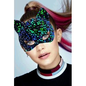 Siyah Kadife Kumaş Üzerine Mavi Yeşil Payetli Pullu Parti Maskesi 16x14 Cm