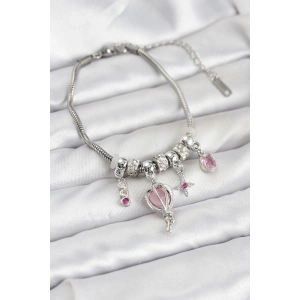 Pirinç Gümüş Renk Pembe Kalp Charmlı Kadın Bileklik