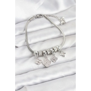 Gümüş Renk Pirinç Yonca Charmlı Kadın Bileklik