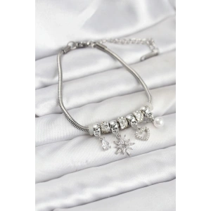 Pirinç Gümüş Renk Kalpli Model Charmlı Kadın Bileklik