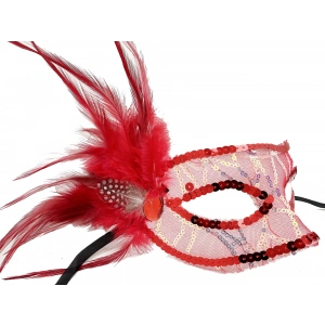 Kırmızı Renk Yandan Tüylü Pul Payet İşlemeli Parti Maskesi 23x12 Cm