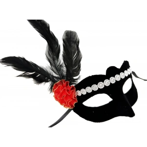 Siyah Renk Süet Kaplama Gümüş Dantelli Kırmızı Gül Tasarımlı Parti Maskesi 18x20 Cm