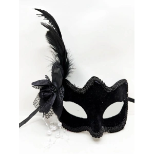Siyah Renk Yandan Tüylü Beyaz İncili Süet Kaplama A Kalite Lüks Parti Maskesi 20x23 Cm