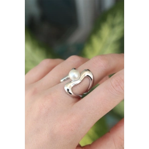 Pirinç Gümüş Renk Ayarlanabilir İnci Taşlı Yüzük