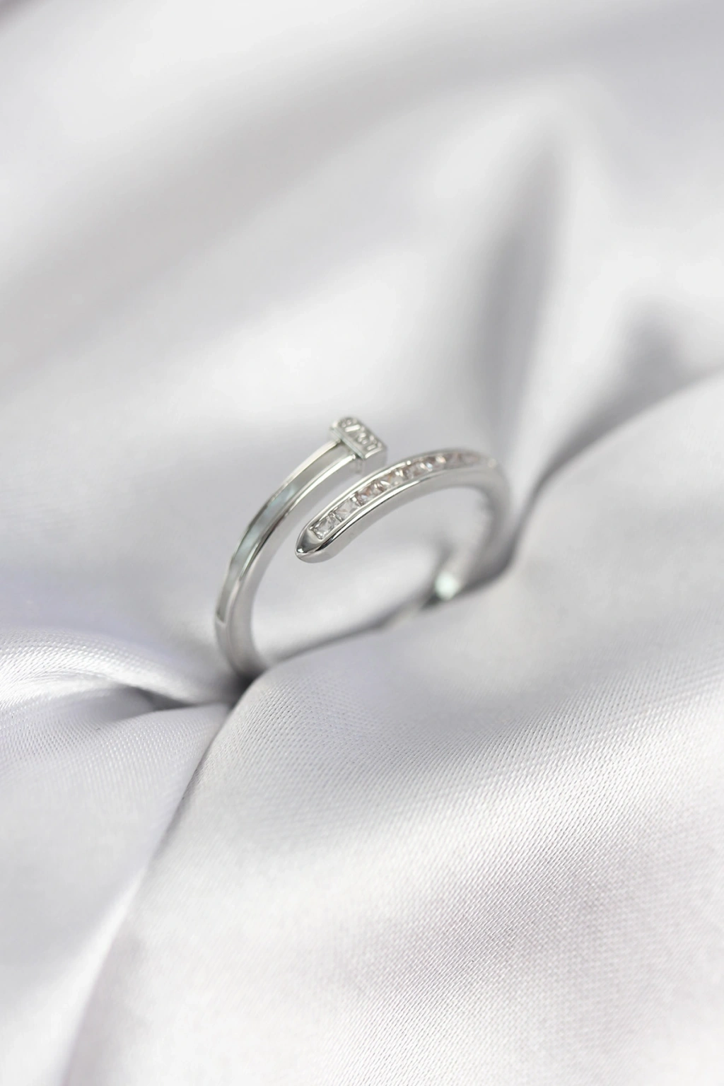 Zirkon Taşlı Gümüş Renk Yassı Çivi Model Kadın Yüzük